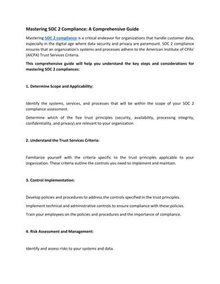 SOC 2, or System and Organization Controls 2, is a trust service criteria program designed by the American Institute of CPAs (AICPA). It focuses on how organizations manage and protect client data. The SOC 2 Control Implementation involves establishing and maintaining a set of controls that address five trust service principles: security, availability, processing integrity, confidentiality, and privacy.